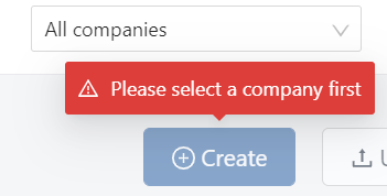 If the user has access to the company selector, it is possible to view the data for All companies at the same time. However, creation and uploads will be disabled: the user must select a company before create or upload data.